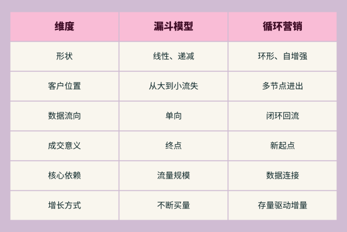 漏斗是线性的、递减的;循环是环形的、自增强的。循环营销把成交当作新起点,而不是终点。